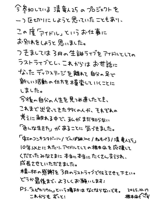 根本さんはXに自筆の文書の接写を投稿。「今参加している清竜人25のプロジェクトを一つ区切りにしようと思っていたこともあり、この度『アイドル』というお仕事にお別れをしようと思いました。」と心境を明かしました。