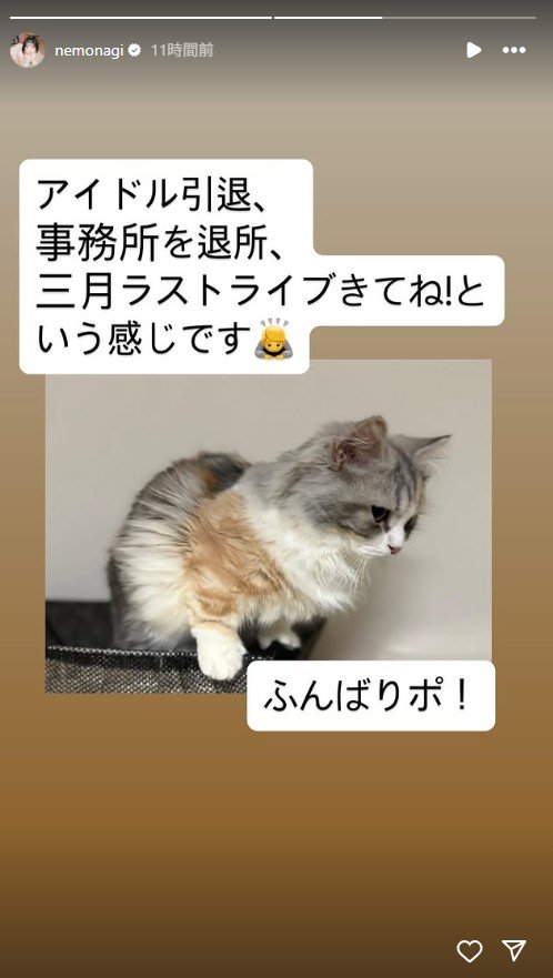 根本さんは合わせて、インスタグラムのストーリーズにも、猫の写真とともに「アイドル引退、事務所を退所、三月ラストライブきてね!」とテキストを投稿しています。