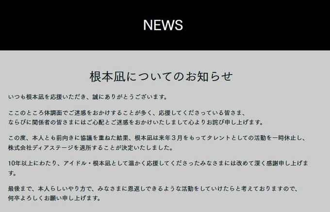合わせて公式サイトでも「根本は来年3月をもってタレントとしての活動を一時休止し、株式会社ディアステージを退所することが決定いたしました。」と掲載されています。