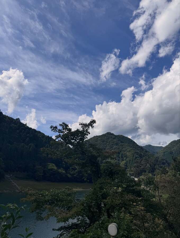 また、緑豊かな山の景観の画像には、青い空に広がる雲が映し出されています。雲の絵文字は、ロケ地周辺の印象的だった景色を表しているようです。