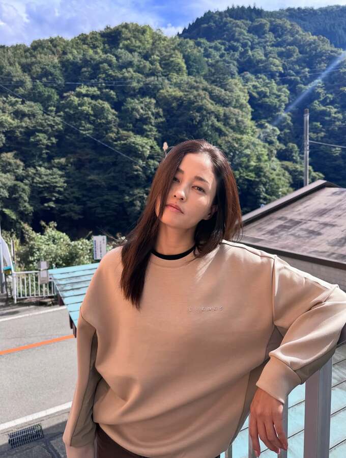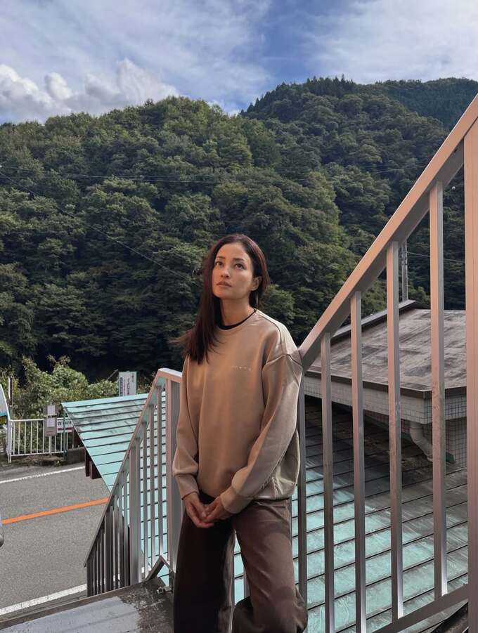 続く画像では、黒木さんは、ベージュのオーバーサイズスウェットと茶系のパンツという異なる衣装に身を包み、同じく山間の風景をバックに撮影されています。どうやら最初のカメラの絵文字は、撮影を意味しているようです。