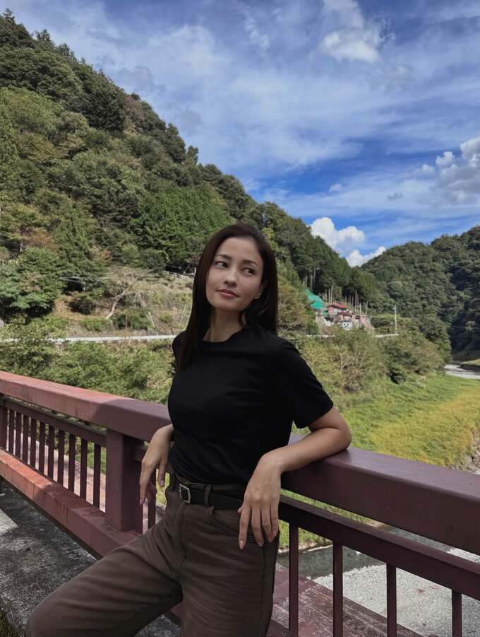 最初の画像では、黒木さんは、黒い半袖トップスに茶色のパンツを着用し、山々と谷が広がる橋の上の景色を背景に、穏やかな表情で遠方を見つめる姿が印象的です。