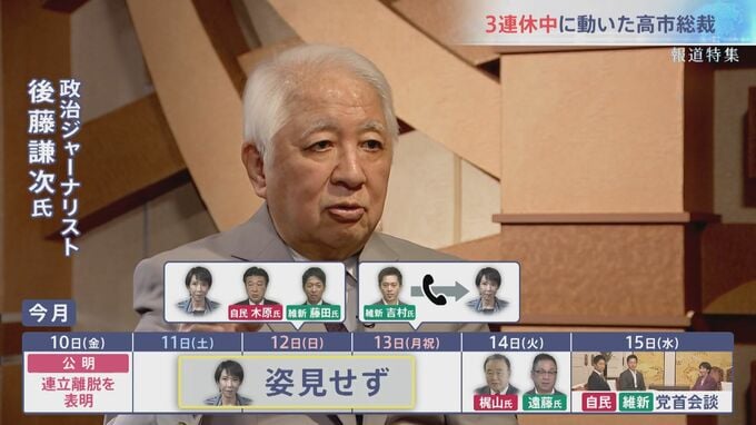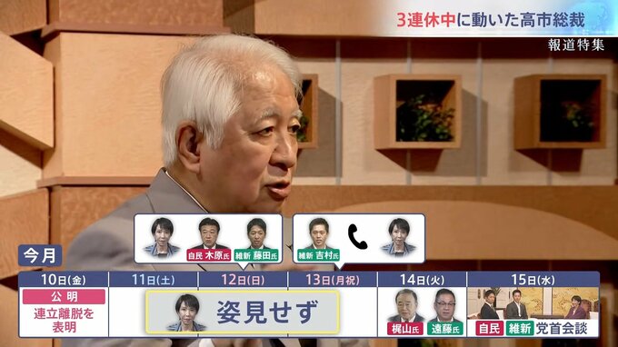 14日になると、自民・梶山国対委員長と維新・遠藤国対委員長のいわゆる表の会議、自民と維新の連立工作が表面化するわけです」