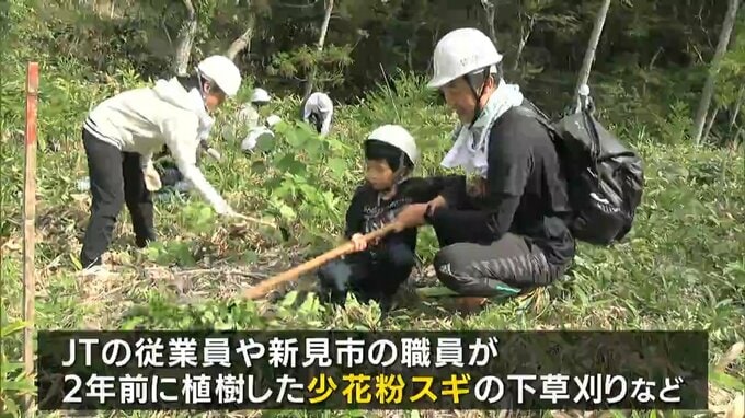 2年前に植樹し、1メートル前後に成長した約600本の少花粉スギの下草刈りなどを行いました。