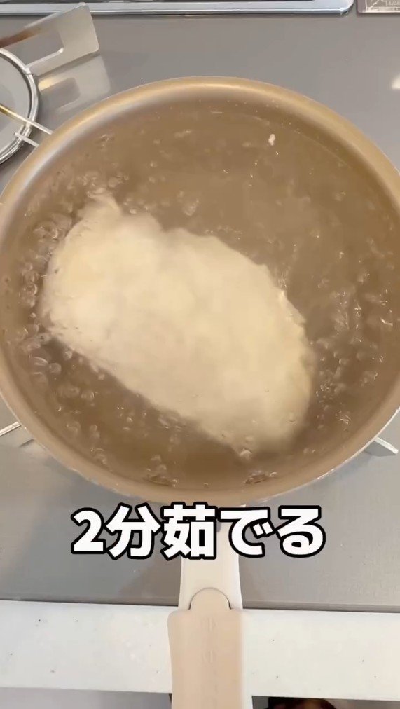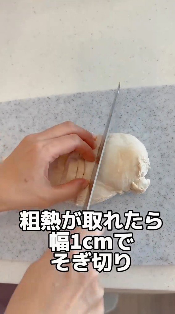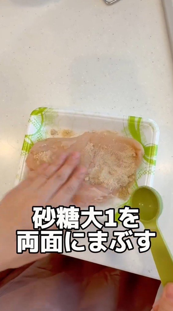 作り方は簡単で、まず鶏むね肉に砂糖大さじ1をまぶし、冷蔵庫で10分間冷やします。その後、水分をキッチンペーパーで拭き取り、沸騰したお湯で2分茹でます。火を止めたまま1時間ほど置き、鶏むね肉が冷めるのを待ちます。