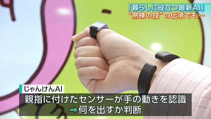 「じゃんけんAI」は、親指に付けたセンサーが手の動きを認識し、AIが何を出すか判断する、後出しじゃんけんなのです。それでも、たまに勝ててしまうことも...。
