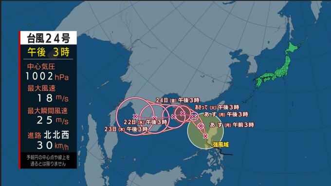 台風24号はフィリピン付近を北北西へ進んでいます。今後は進路を南西へと変え、カンボジア方面へ進む見込みです。