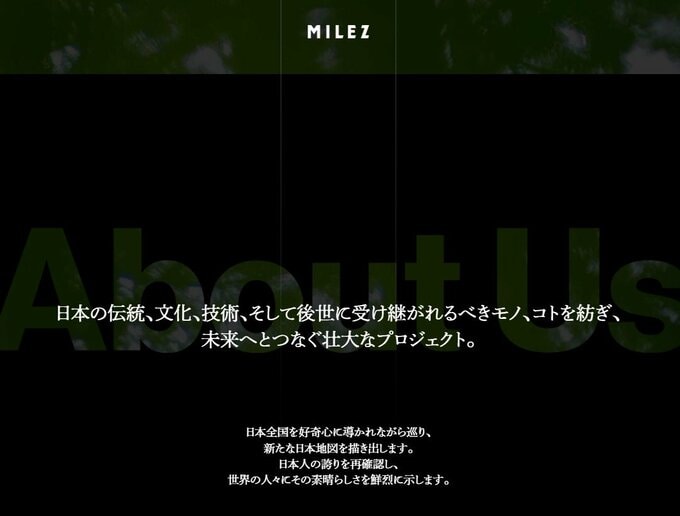 「MILEZ」の公式サイトでは「日本の伝統、文化、技術、そして後世に受け継がれるべきモノ、コトを紡ぎ、未来へとつなぐ壮大なプロジェクト。日本全国を好奇心に導かれながら巡り、新たな日本地図を描き出します。日本人の誇りを再確認し、世界の人々にその素晴らしさを鮮烈に示します。」と、記しています。