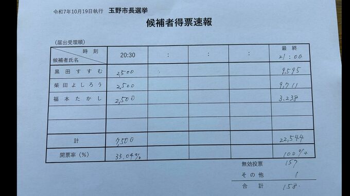 午後9時発表の開票結果は【画像①】の通りで、柴田氏が黒田氏に対して僅差での当選です。