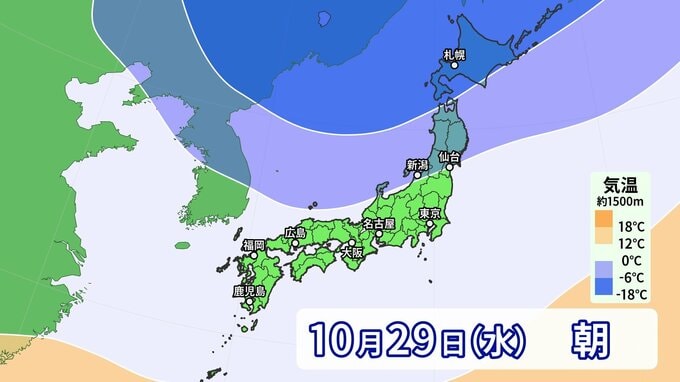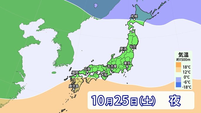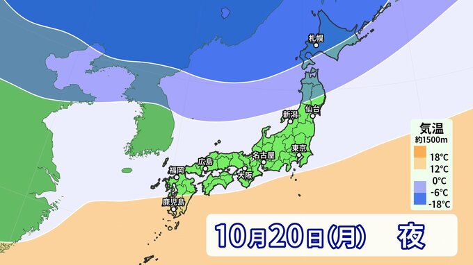 暖気は南に下がり、北日本には0℃以下という山で雪が降る目安の寒気が入ったほか、北海道には-6℃以下という平地で雪の目安の寒気がかかって来ました。