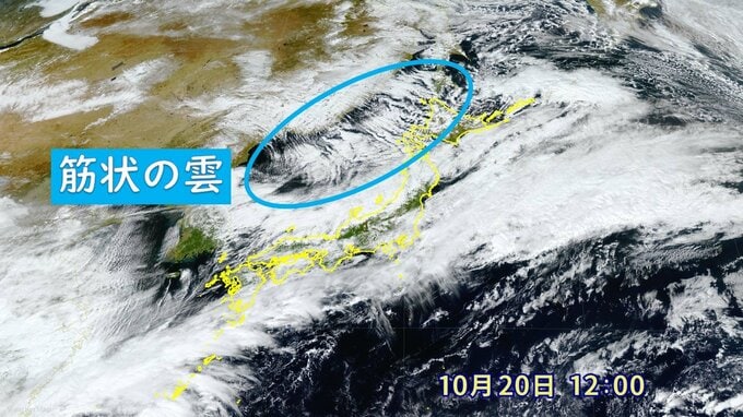 20日(月)現在南の海上では、熱帯の雲が渦巻いている一方で、北の海上では上空に寒気が入るとよく見られる「筋状の雲」が現れ、北海道では20日(月)雪の便りが届きました。
