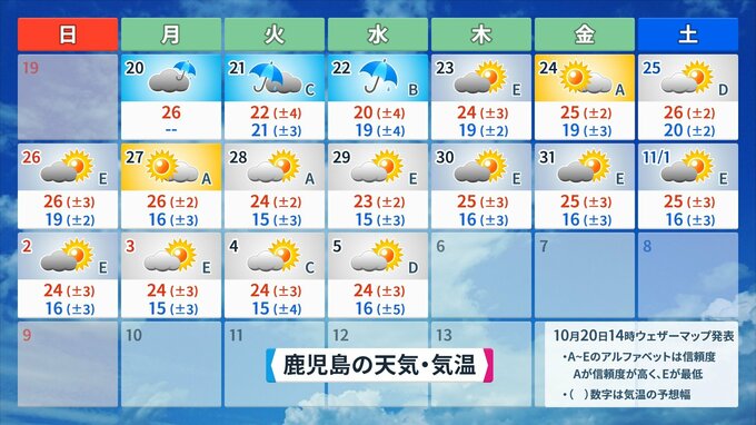 鹿児島はまだ夏日(最高気温25℃以上)が多いものの、これまでに比べれば、気温は上がりにくくなります。