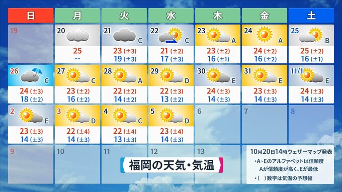 福岡では先週、13日(月)は真夏日(30℃以上)になり、17日(金)も29.9℃までもあがりましたが、ことしはもう真夏日なることはない見込みです。