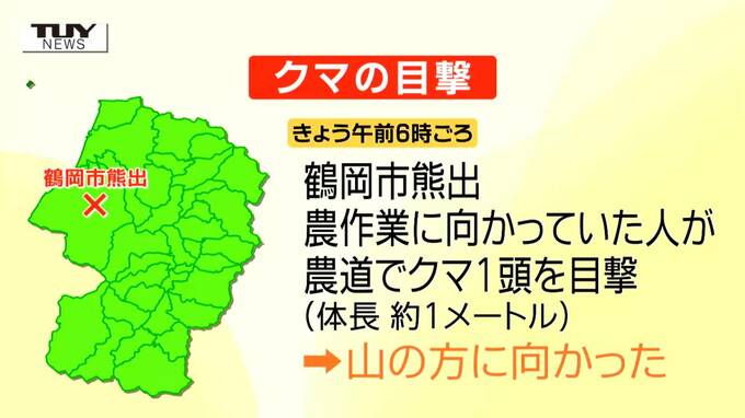 また、鶴岡市熊出ではきょう午前6時ごろ、農作業に向かっていた人が農道にクマ1頭がいるのを目撃しました。クマは体長およそ1メートルと見られ、その後、山の方に向かったということです。
