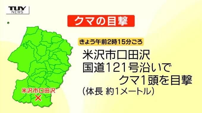 きょう午前2時15分ごろ、米沢市口田沢の国道121号沿いでクマ1頭が目撃されました。クマは体長およそ1メートルと見られています。