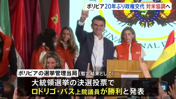 南米・ボリビアで大統領選挙が行われ、野党・中道派のロドリゴ・パス氏が当選を確実にしました。およそ20年続いた“反米左派政権”から大きな政策転換が予想されます。記者「いま、ロドリゴ・パス氏が会場に現れま…