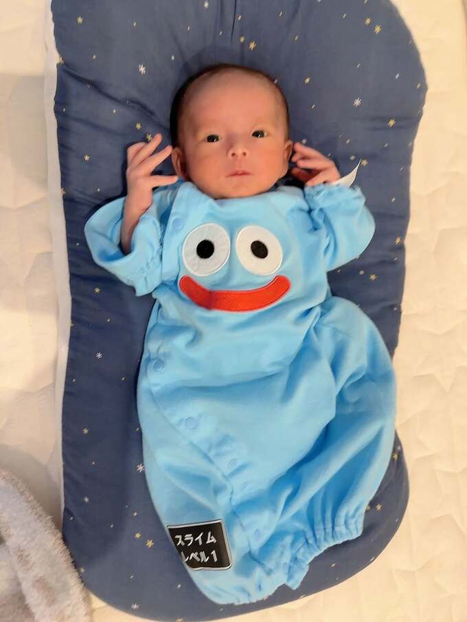 続けて「スライム服!双子に着せるの夢で生まれる前からずっと大事に置いてたの、ついに今日着せるの叶いました!」「スライムレベル1って書いてある最高」「お兄ちゃんのうんち落として秒で着替えになりましたが」と、綴りました。