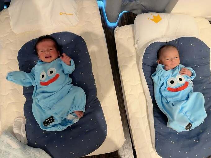 投稿された画像では、中川翔子さんの双子の子どもたちが、ゲーム作品「ドラゴンクエスト」シリーズのモンスター「スライム」のデザインが施された服を身に着けている様子が見て取れます。