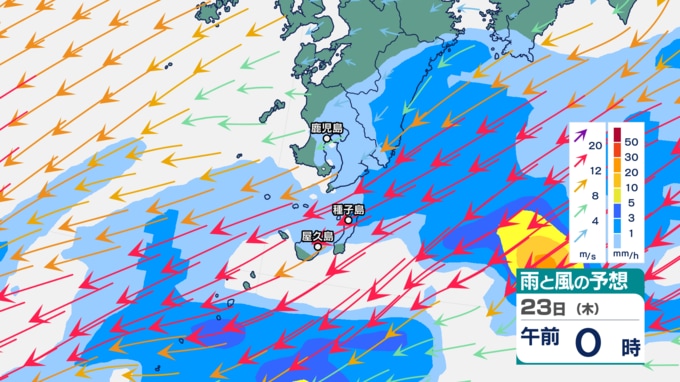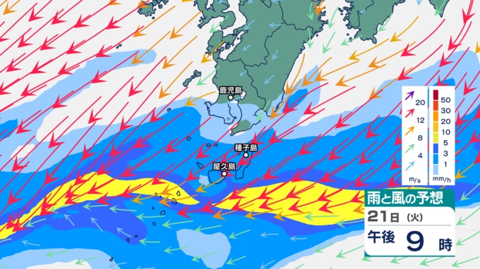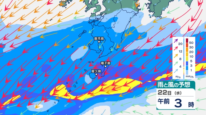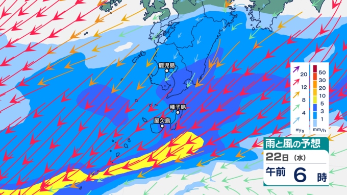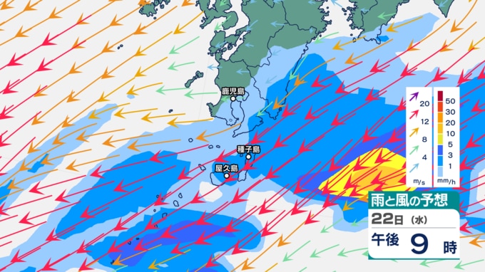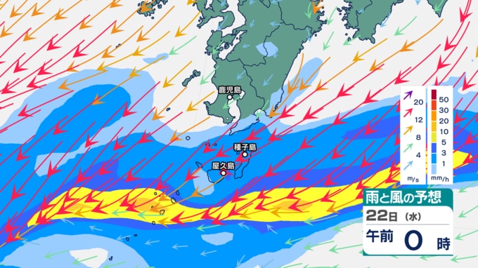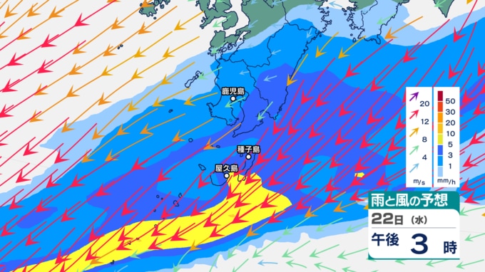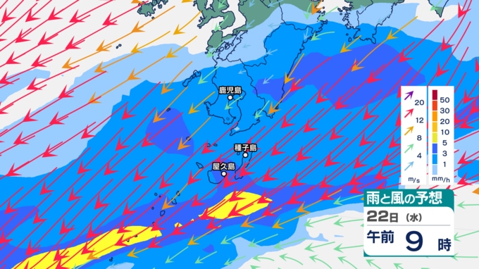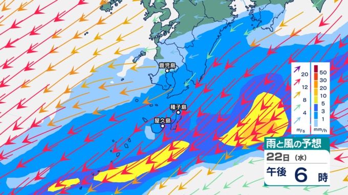 22日、鹿児島県では長時間、雨が降り、時折強まるでしょう。東よりの風も強く、傘を指していても濡れるような降り方となり、前線の北上次第では、種子島や屋久島だけでなく、鹿児島本土にも発達した雨雲が流れ込むかもしれません。警報級の大雨となる可能性がありますので、22日の雨には注意が必要です。