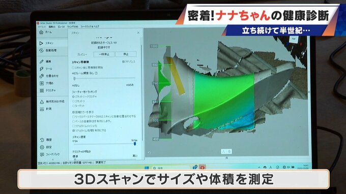 今回行われていたのは撤去ではなく、ナナちゃんの健康診断。バラバラに分解されたナナちゃんをパーツごとに3Dスキャンし、サイズや体積を精密に測定。重さや劣化状態など、詳細にチェックしていきます。