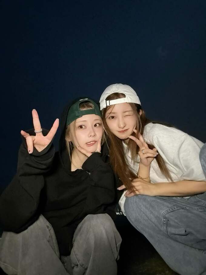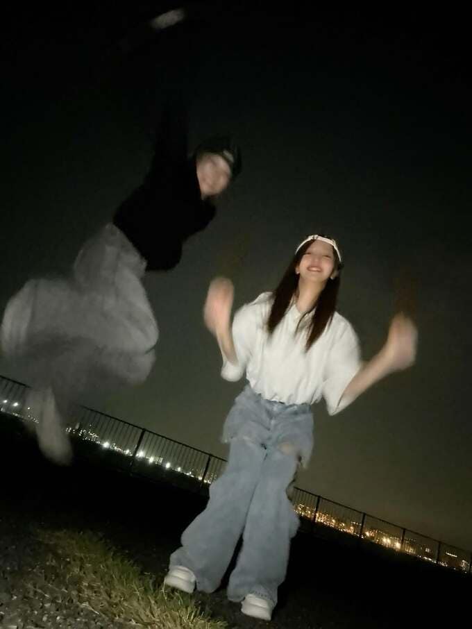 夜の屋外で様々なポーズをとる二人の姿が収められています。ピースサインや顎に手を当てるショット、跳ねるような動きのある写真など、親密で楽しげな雰囲気が伝わってきます。