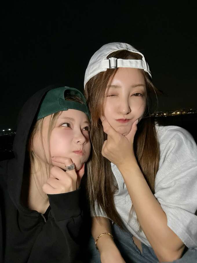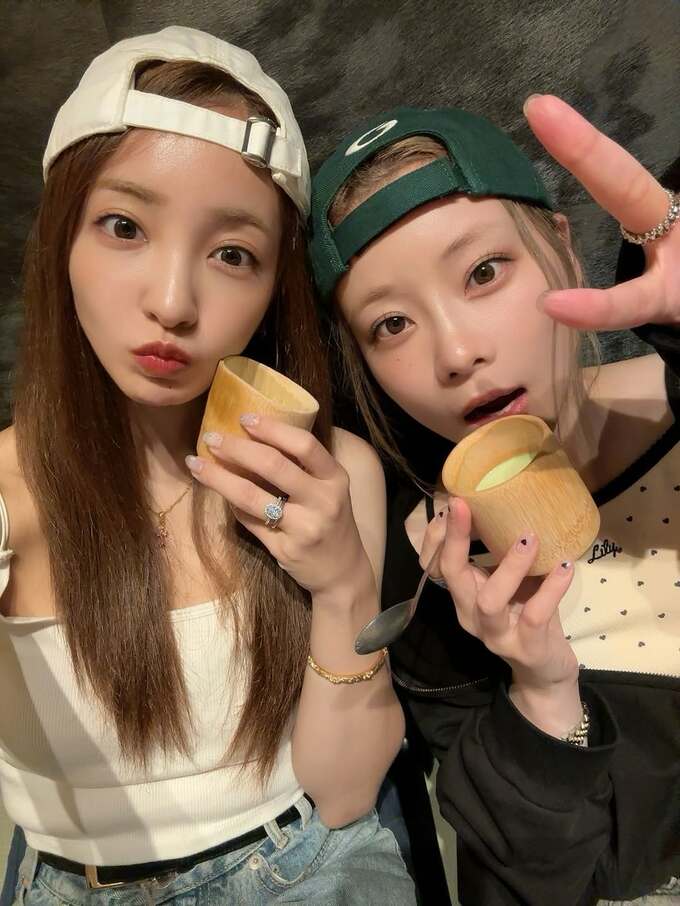 投稿写真では、板野さんが白いキャップと白いトップスを着用し、重盛さんは緑のキャップと黒いパーカーというスタイルで登場。