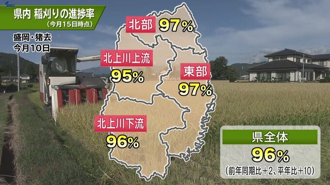県によりますと、県内の稲刈りの地域別の進捗率は、「東部」と「北部」が97パーセントと最も進んでいて、「北上川下流」が96パーセント、「北上川上流」が95パーセントとなっています。