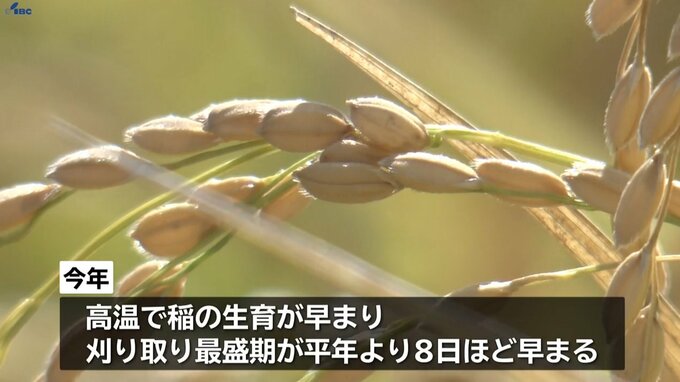 2025年も2024年、2023年並みに高温が続いて稲の生育が早まったことから、県全体で刈取りの最盛期が平年より8日ほど早まっています。