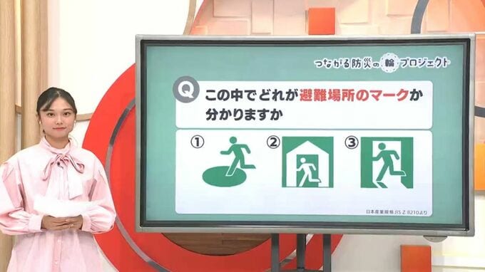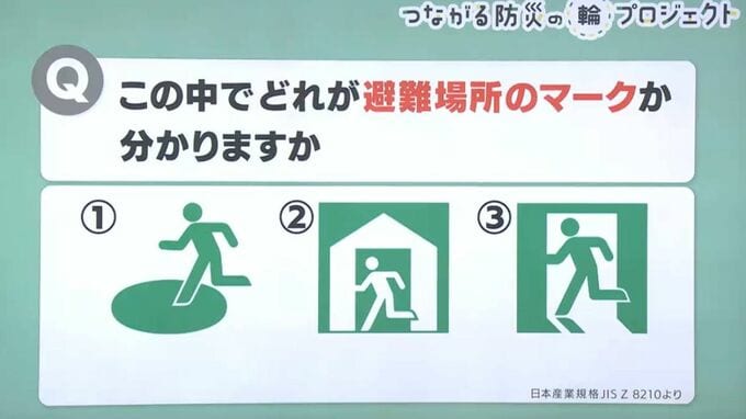 問題は、こちら。3つのマークの中で災害時の「避難場所」を示しているのはどれでしょうか?(画像①)