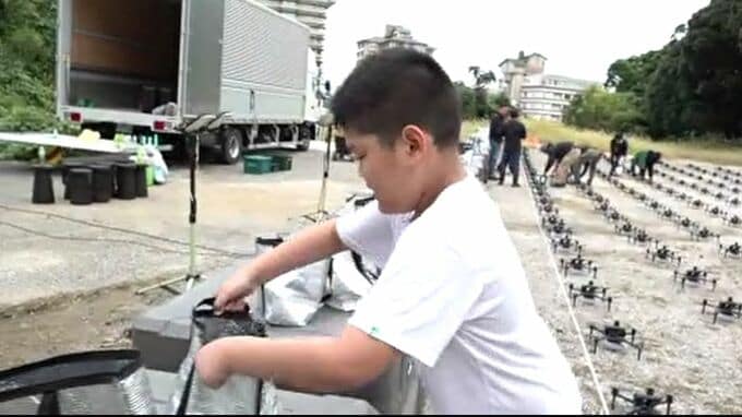 迎えたドローンショー当日。出発地点ではまだ明るいうちから入念な準備が進められてました。ボランティアで集まった地元住民らも協力しながら、500基のドローンを並べます。