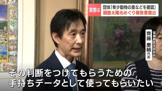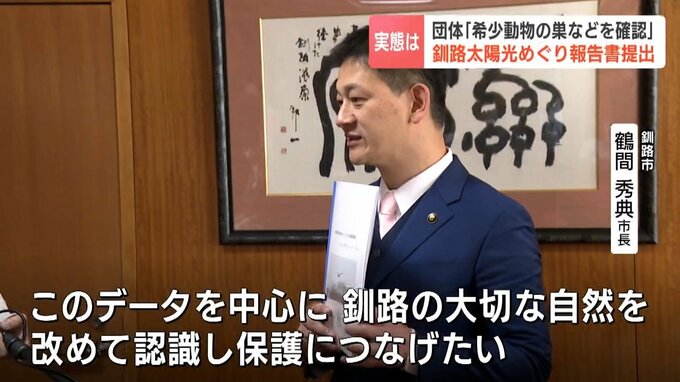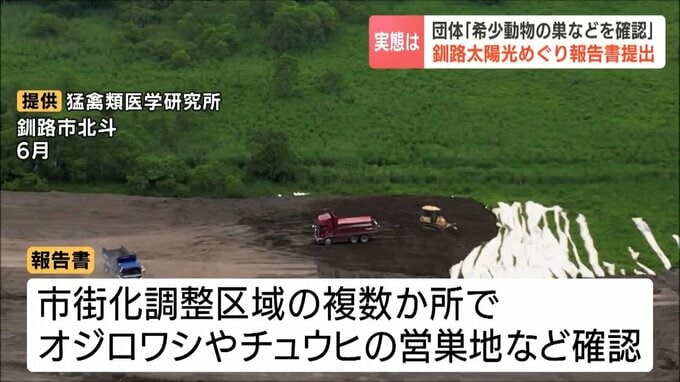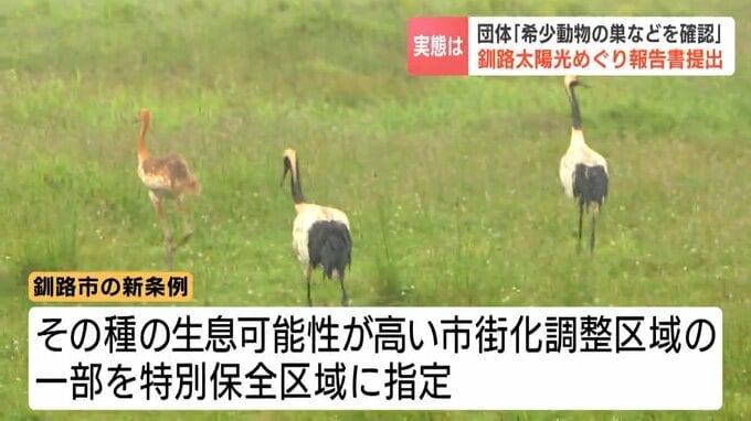 太陽光発電施設の建設を許可制にする新たな条例を施行した北海道釧路市で、市街化調整区域の複数か所に希少動物の巣などを確認したとする調査報告書を民間の団体がまとめ、市に提出しました。