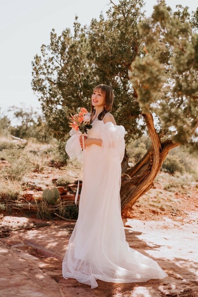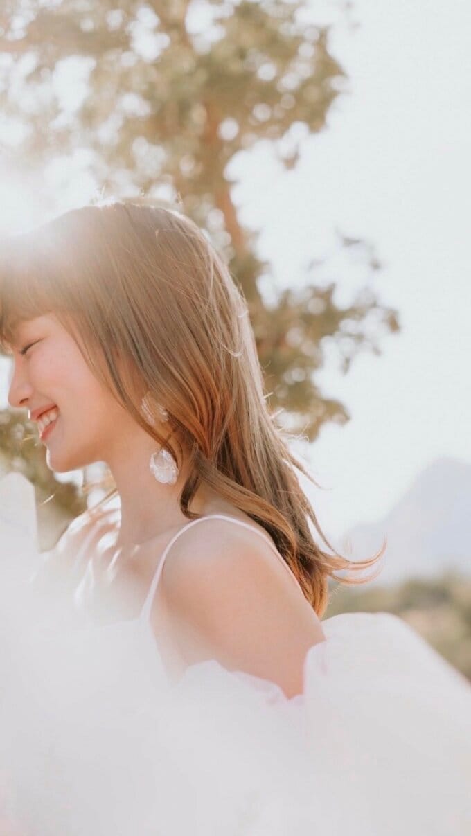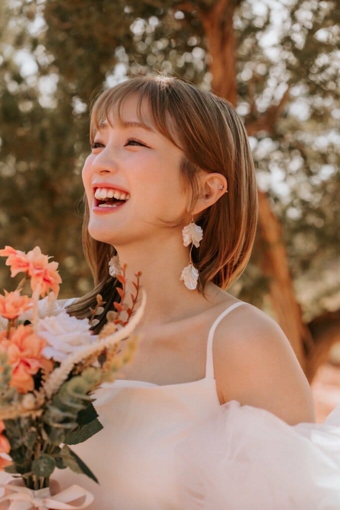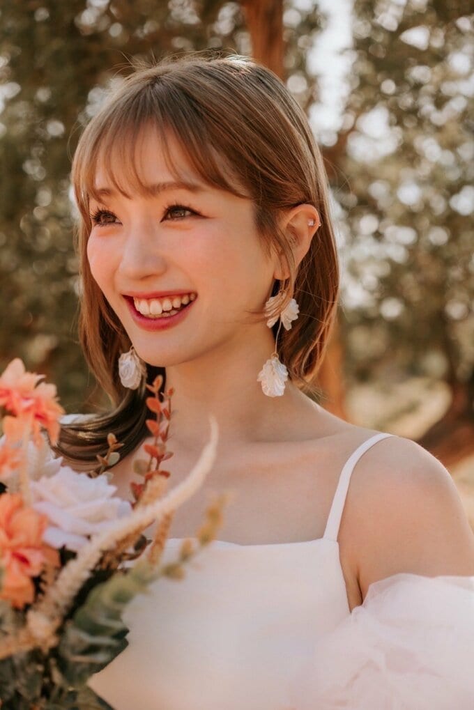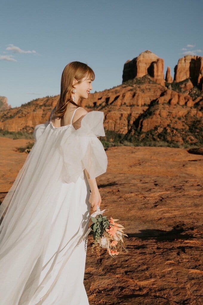 乾いた大地や岩山を背景に、花束を手に微笑む姿が撮影されています。柔らかな日差しの中、幸せな表情を見せる瀬川さんの新たな門出を印象づける写真となっています。
