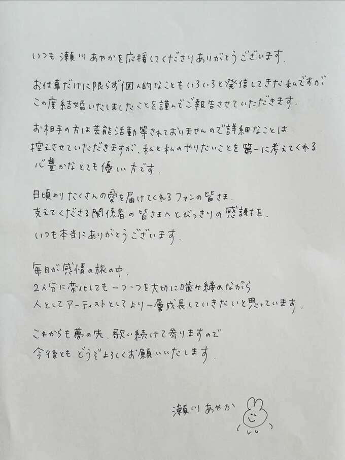 瀬川さんは、「毎日が感情の旅の中、2人分に変化しても一つ一つを大切に噛み締めながら、人間としてアーティストとしてより一層成長していきたいと思っています」と、結婚後も変わらず音楽活動を続ける意向を示し、「これからも夢の先、歌をうたい続けて参りますので今後とも瀬川あやかをどうぞよろしくお願いいたします」と締めくくっています。
