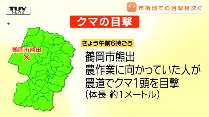 また、鶴岡市熊出(くまいで)では、きょう午前6時ごろ、農作業に向かっていた人が農道にクマ1頭がいるのを目撃しました。この地区では、今月16日にも親子と見られるクマ3頭が河川敷を歩いているのが目撃されています。