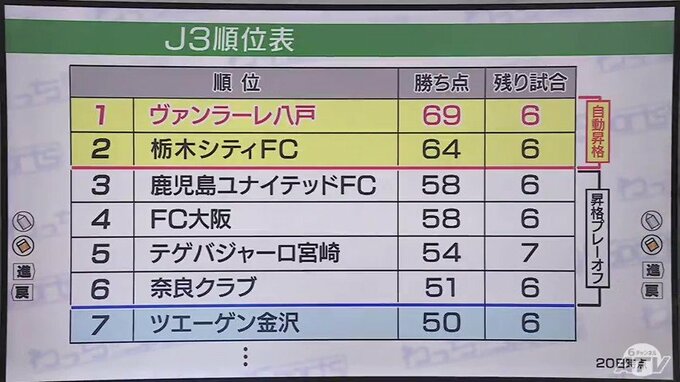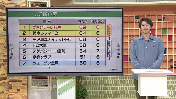 ヴァンラーレは19日の勝利でJ2昇格プレーオフ圏内となる6位以上を決めました。6試合を残して首位となっていますが、ヴァンラーレが目指しているのは優勝はもちろんですが、2位以上です。