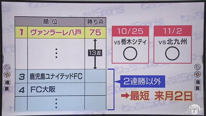 今後の戦いについては、今週と来週の試合でヴァンラーレが2連勝して、3位以下のチームとの勝ち点が13以上開けば、最短で11月2日にJ2昇格が決まる可能性があります。