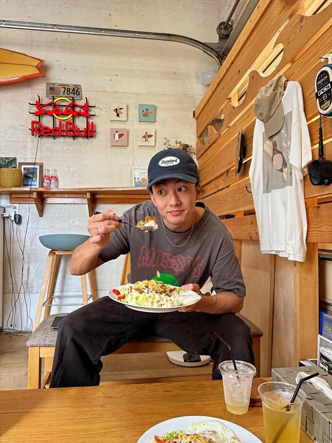 投稿の動画には、海の青さと対照的な波の白い泡が映し出され、サーフィンの迫力が伝わってきます。また、カフェのような空間での食事シーンの写真も投稿されており、プライベートな一面も垣間見えます。