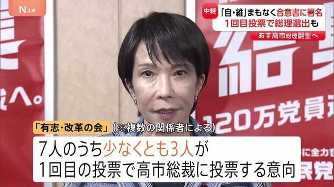 まもなく自民と維新が党首会談を行い、連立政権合意書に署名する予定です。国会から最新情報を堀記者に伝えてもらいます。多くの報道陣が待ち受ける中、自民党の幹部議員らが会談部屋に続々と入っています。まもな…