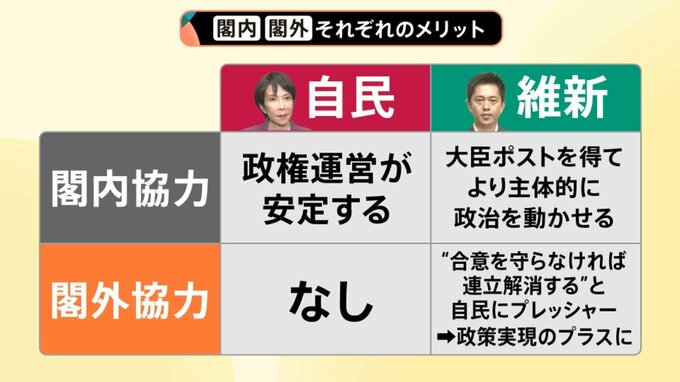 閣外協力の連立政権とは?自民にメリットなし…維新は政策実現のプラスに