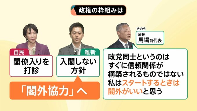 19日、維新の馬場前代表も「政党同士というのはすぐに信頼関係が構築されるものではない」「私はスタートするときは閣外がいいと思う」と発言しました。