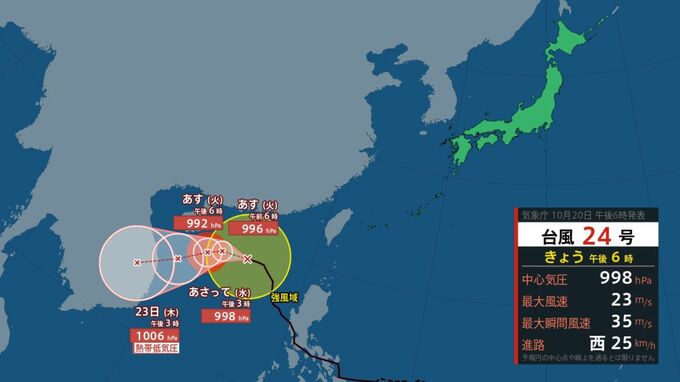 台風はきょう(20日)午後6時現在、南シナ海にあって、1時間におよそ25キロの速さで西へ進んでいます。
