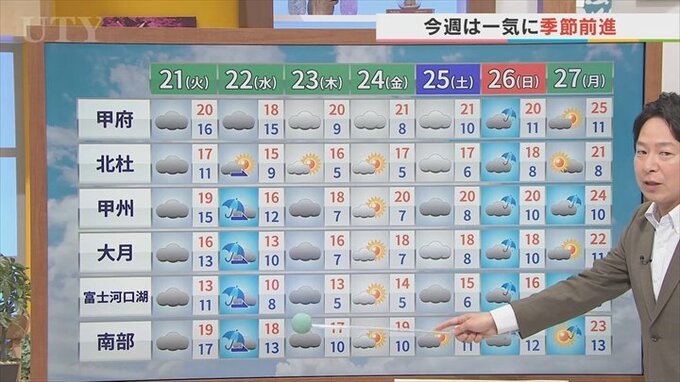 その後天気は回復傾向で、標高の高いところは朝5℃まで下がるところも出てきそうです。しばらくすっきりしない空模様が続きまして、次に晴れて気温が上がるのは来週の月曜日で甲府は25℃を予想しています。