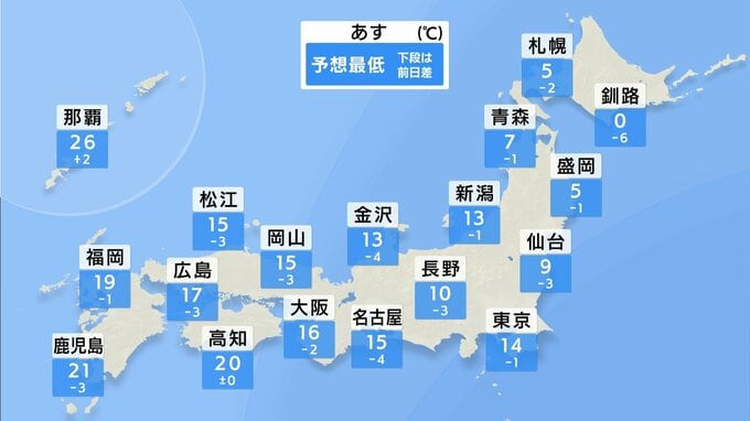 月曜日は上空に寒気が流れ込み、稚内では初雪が観測されるなど、冬の便りが届きました。火曜日は月曜日よりも気温が低くなる所が多そうです。朝の気温は月曜日と同じか低くなるでしょう。東京は14℃で月曜日より冷…