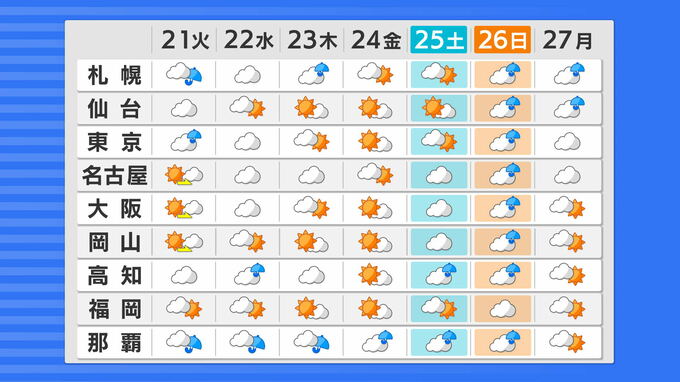 一方で、本州の南には秋雨前線が停滞しています。そのため今週は各地、雲が広がりやすいでしょう。また、台風周辺の暖かく湿った空気は、前線を刺激して活発化させることがありますので、特に鹿児島県などの前線に近い太平洋側では、大雨に注意をする必要があります。