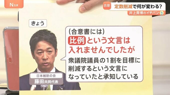 20日、日本維新の会 藤田共同代表も「(合意書には)比例という文言は入れませんでしたが、衆議院議員の1割を目標に削減するという文言になっていたと承知している」と話しています。