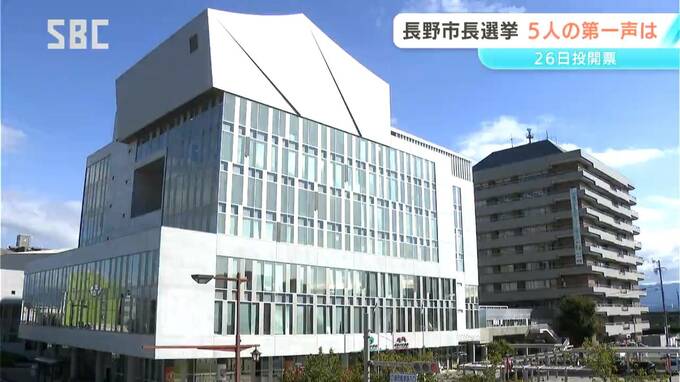 任期満了に伴う長野市長選挙が19日告示され、各候補が第一声をあげました。立候補したのは届け出順に、新人の小泉一真さん、新人の平本浩一さん、現職の荻原健司さん、新人の草間重男さん、新人の野々村博美さん、…