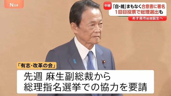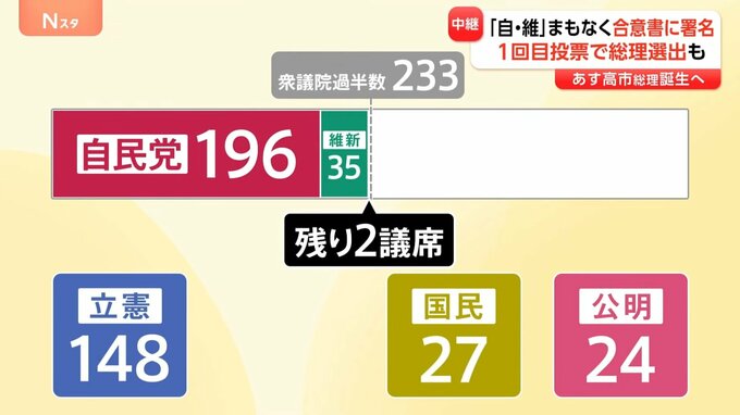 衆議院で自民と維新のあわせた議席では過半数まで「2議席」足らないことから、この「少なくとも3議席」が加わることで、1回目の投票で高市総裁が勝利する公算が大きくなっています。