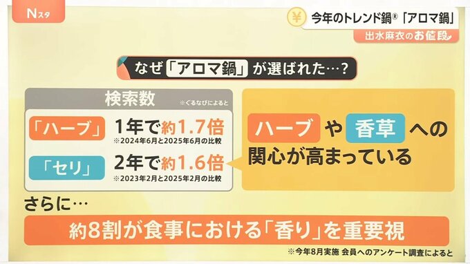 アロマ鍋が選ばれた理由について、ぐるなびは「ハーブ」や「香草」への関心が高まっているといいます。