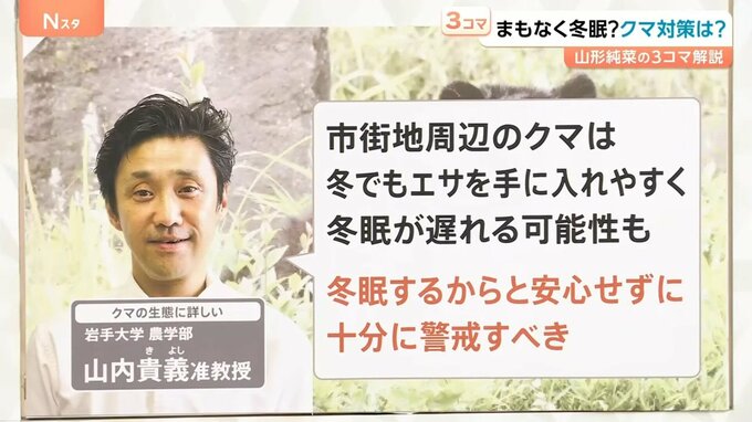 これからの時期、クマは冬眠に入ります。例年は12月中旬ごろということですが、冬眠の時期は市街地の出没も落ち着くのか、山内準教授によると、「市街地周辺のクマは冬でもエサを手に入れやすく、冬眠が遅れる可能性もある。冬眠するからと安心せずに十分に警戒すべき」ということでした。
