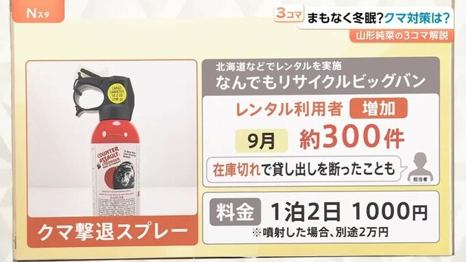 対策の一つとして重要なのが、「クマ撃退スプレー」です。ただ、クマ撃退スプレーは飛行機への持ち込みも手荷物も不可ということですが、今、現地でレンタルできる流れができているそうです。